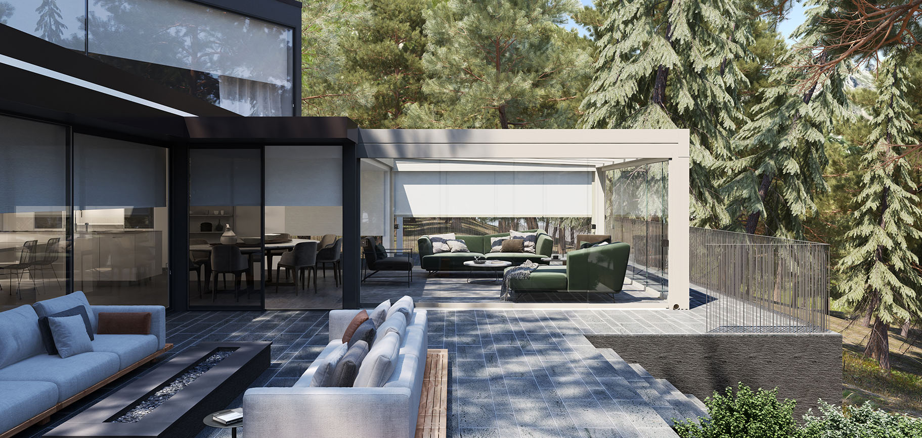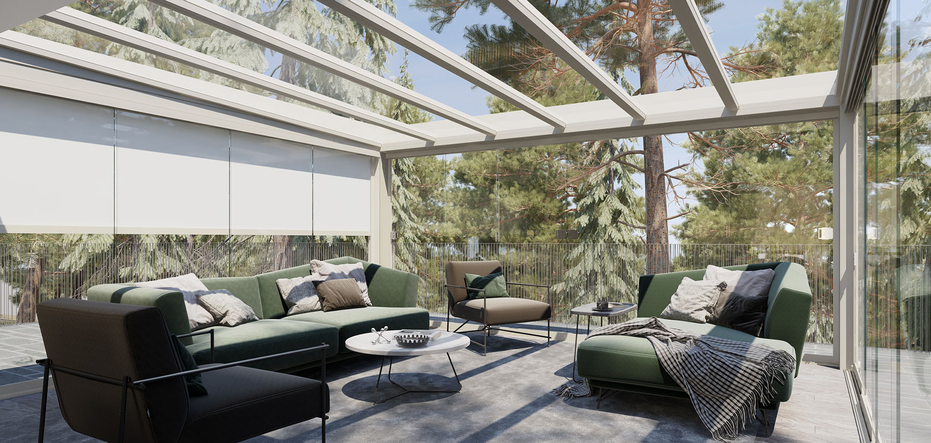 Possibilità di chiusura con tende tecniche verticali integrate, sistemi di vetrate scorrevoli e Roof tens per una schermatura sopra e sotto tetto
