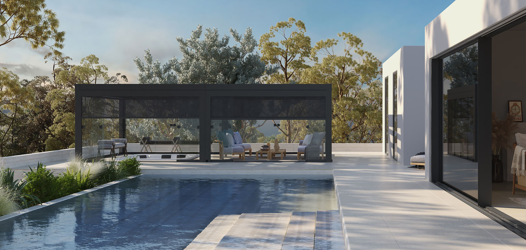 SUNLIGHT può essere integrata con molteplici tipologie di chiusure, vetrate scorrevoli Line Glass a 3 vie o con il sistema di tende a caduta verticali Vertika Sunlight.